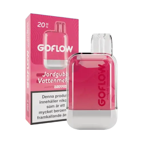 Dripped GoFlow Jordgubb Vattenmelon 20mg är en engångsvape med en kombination av jordgubb och vattenmelon. Nikotinhalten uppgår till 20 mg/ml. Produkten levereras som en förfylld enhet och är avsedd att användas direkt utan behov av laddning eller påfyllning.