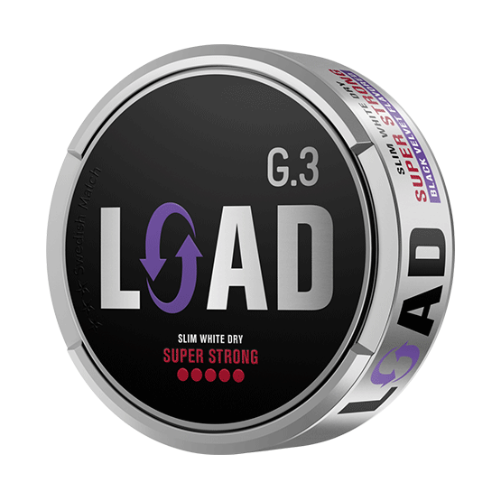 General G.3 LOAD Slim White Dry Super Strong Portion är ett starkt, vitt och torrt snus från Swedish Match. Snuset innehåller 30% mer nikotin jämfört med vanliga General G.3 Extra Strong.