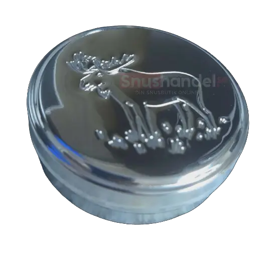 En klassisk snusdosa med ett motiv av en älg på locket. Dosan är utformad för att passa vanliga snusdosor och fungerar därför som ett yttre skal där en befintlig dosa kan placeras.